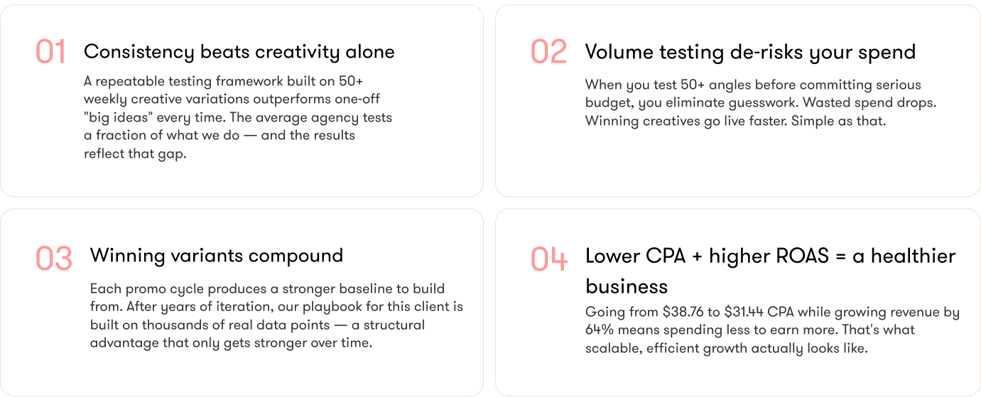But here's what makes it even more powerful over time, it compounds. Each promo makes the next one smarter. Each winning variant becomes the new baseline to beat. After years of running this for our client, we've built a proprietary creative playbook based on thousands of real data points from their specific audience. That's not something a new agency can walk in and replicate. It's a structural advantage built through process, not luck.